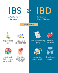 IBS (Irritable Bowel Syndrome) Treatment IBS treatment focuses on managing symptoms: - Dietary Changes: Avoiding trigger foods, increasing fiber intake. - Stress Management: Techniques like meditation, deep breathing. - Medications: Antispasmodics, laxatives, or anti-diarrheal medications. IBD (Inflammatory Bowel Disease) Treatment IBD treatment aims to reduce inflammation and manage symptoms: - Medications: Aminosalicylates, corticosteroids, immunomodulators, or biologics. - Lifestyle Changes: Dietary modifications, stress management. - Surgery: May be necessary in some cases to remove damaged portions of the bowel